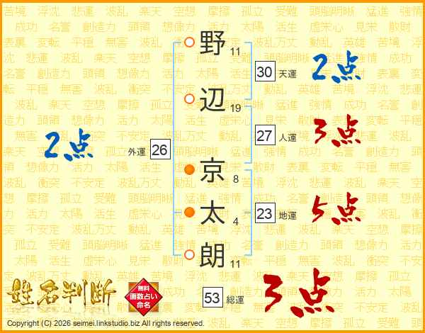 野(11画)辺(19画) 京(8画)太(4画)朗(11画)