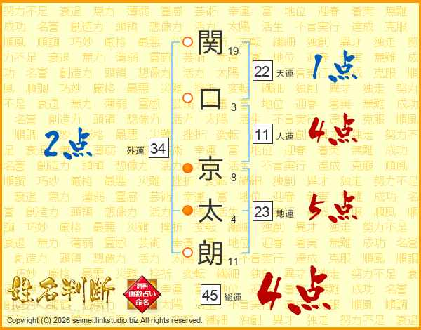 関(19画)口(3画) 京(8画)太(4画)朗(11画)