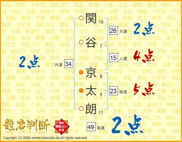 関(19画)谷(7画) 京(8画)太(4画)朗(11画)