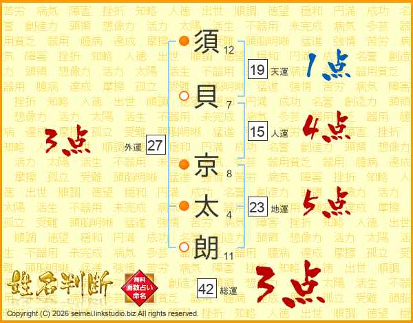 須(12画)貝(7画) 京(8画)太(4画)朗(11画)