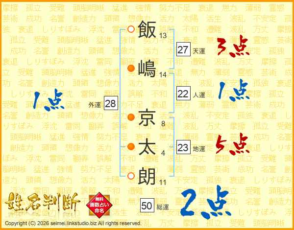 飯(13画)嶋(14画) 京(8画)太(4画)朗(11画)