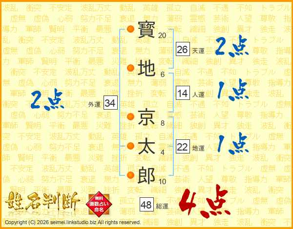 寳(20画)地(6画) 京(8画)太(4画)郎(10画)