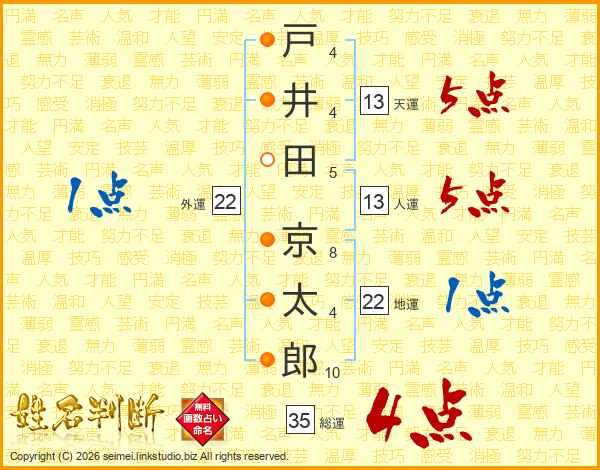 戸(4画)井(4画)田(5画) 京(8画)太(4画)郎(10画)