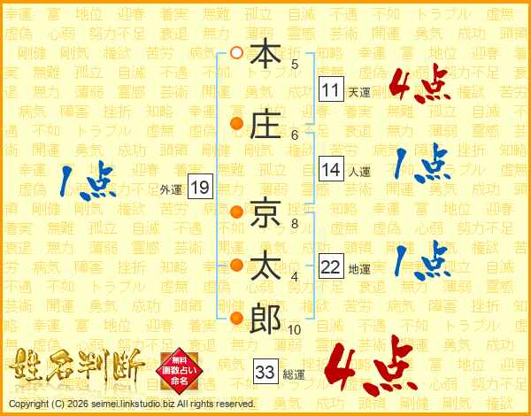 本(5画)庄(6画) 京(8画)太(4画)郎(10画)