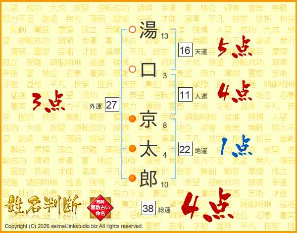 湯(13画)口(3画) 京(8画)太(4画)郎(10画)