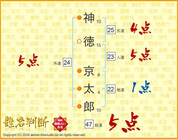 神(10画)徳(15画) 京(8画)太(4画)郎(10画)