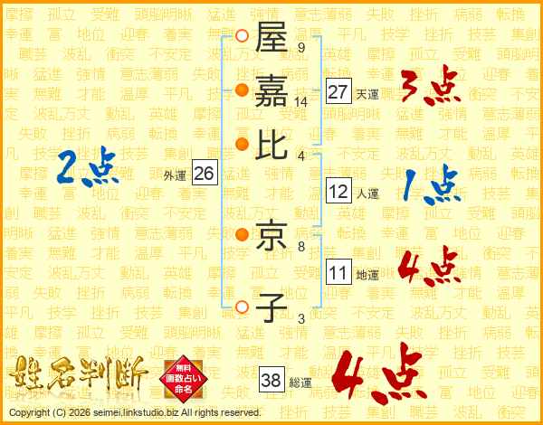 屋(9画)嘉(14画)比(4画) 京(8画)子(3画)