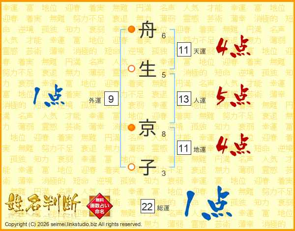 あなたの人生を表す1番重要な運勢です。生涯を通じて影響する総合運となり、主に50歳以降の晩年期に影響を及ぼします。苗字と名前の合計画数。