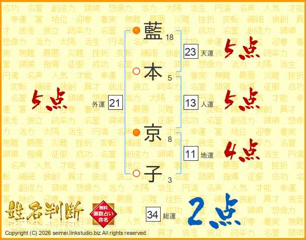 藍(18画)本(5画) 京(8画)子(3画)