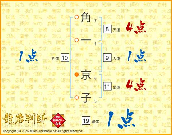 生活面を象徴する運勢です。外部から受ける影響力を表し、結婚運、家庭運や職場、環境への順応性を表します。総運から人運を引いた画数。姓や名が1文字の場合を除く。