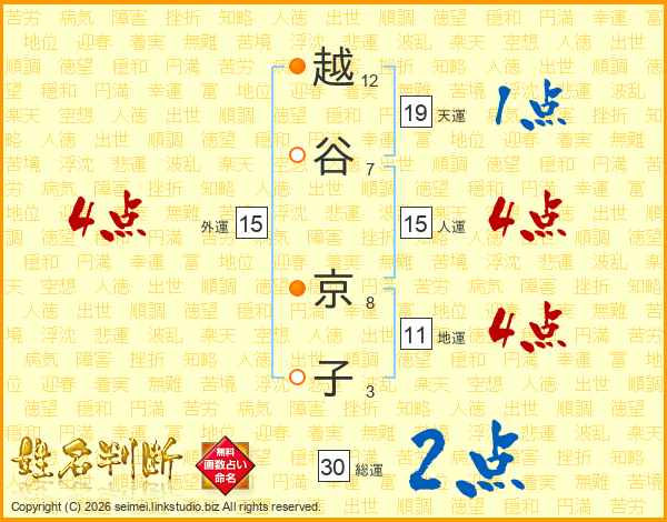 生活面を象徴する運勢です。外部から受ける影響力を表し、結婚運、家庭運や職場、環境への順応性を表します。総運から人運を引いた画数。姓や名が1文字の場合を除く。