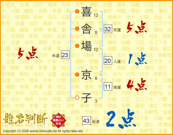 喜(12画)舎(8画)場(12画) 京(8画)子(3画)