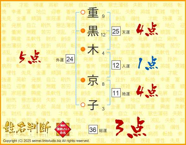 重(9画)黒(12画)木(4画) 京(8画)子(3画)