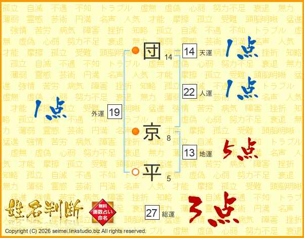 生活面を象徴する運勢です。外部から受ける影響力を表し、結婚運、家庭運や職場、環境への順応性を表します。総運から人運を引いた画数。姓や名が1文字の場合を除く。