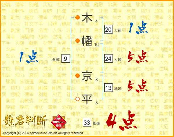 木(4画)幡(16画) 京(8画)平(5画)