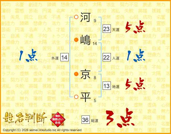 生活面を象徴する運勢です。外部から受ける影響力を表し、結婚運、家庭運や職場、環境への順応性を表します。総運から人運を引いた画数。姓や名が1文字の場合を除く。