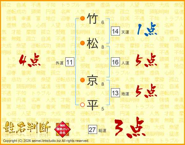 生活面を象徴する運勢です。外部から受ける影響力を表し、結婚運、家庭運や職場、環境への順応性を表します。総運から人運を引いた画数。姓や名が1文字の場合を除く。