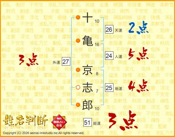 十(10画)亀(16画) 京(8画)志(7画)郎(10画)