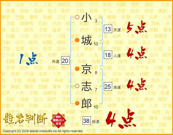 小(3画)城(10画) 京(8画)志(7画)郎(10画)