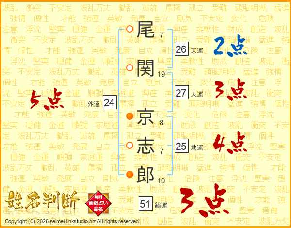 尾(7画)関(19画) 京(8画)志(7画)郎(10画)