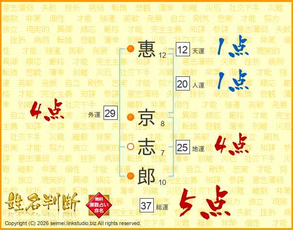 あなたの人生を表す1番重要な運勢です。生涯を通じて影響する総合運となり、主に50歳以降の晩年期に影響を及ぼします。苗字と名前の合計画数。