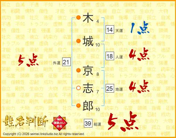 木(4画)城(10画) 京(8画)志(7画)郎(10画)