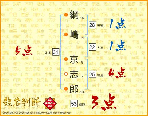綱(14画)嶋(14画) 京(8画)志(7画)郎(10画)
