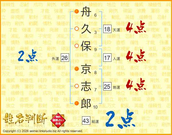 舟(6画)久(3画)保(9画) 京(8画)志(7画)郎(10画)