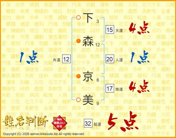 生活面を象徴する運勢です。外部から受ける影響力を表し、結婚運、家庭運や職場、環境への順応性を表します。総運から人運を引いた画数。姓や名が1文字の場合を除く。