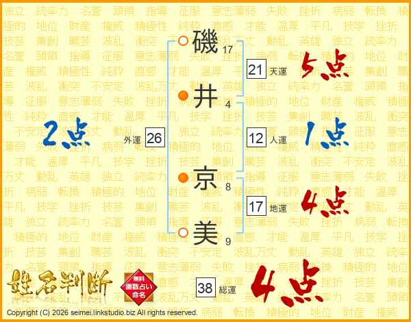 生活面を象徴する運勢です。外部から受ける影響力を表し、結婚運、家庭運や職場、環境への順応性を表します。総運から人運を引いた画数。姓や名が1文字の場合を除く。
