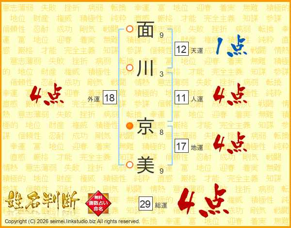 面川京美さんの総運は29画の4点!