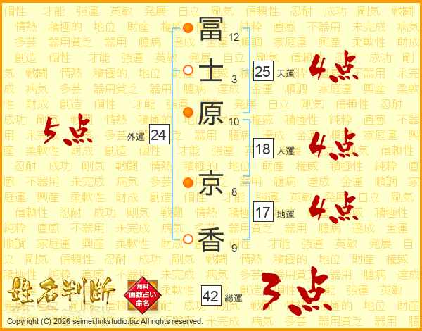 冨(12画)士(3画)原(10画) 京(8画)香(9画)