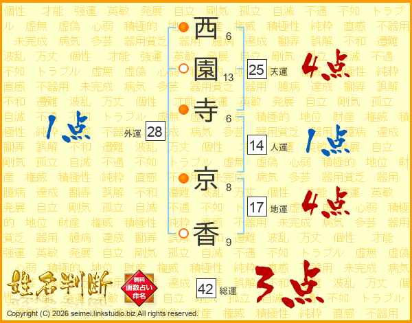 西(6画)園(13画)寺(6画) 京(8画)香(9画)