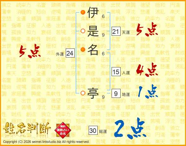 伊是名亭さんの天運は21画の5点!