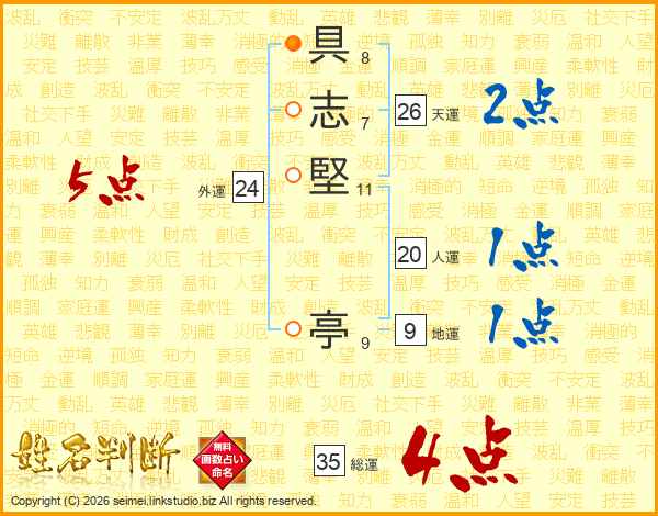 あなたの人生を表す1番重要な運勢です。生涯を通じて影響する総合運となり、主に50歳以降の晩年期に影響を及ぼします。苗字と名前の合計画数。