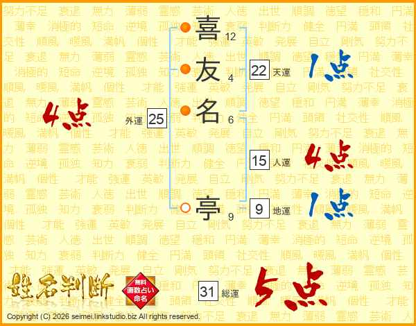 喜(12画)友(4画)名(6画) 亭(9画)
