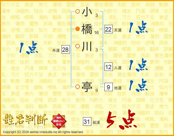 小橋川亭さんの総運は31画の5点!