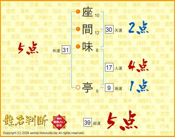 生活面を象徴する運勢です。外部から受ける影響力を表し、結婚運、家庭運や職場、環境への順応性を表します。総運から人運を引いた画数。姓や名が1文字の場合を除く。