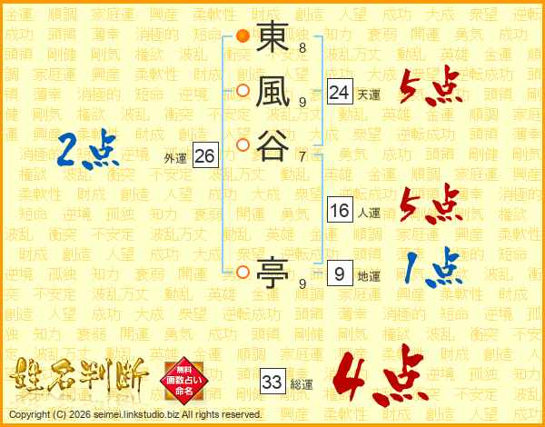 東風谷亭さんの総運は33画の4点!
