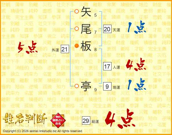 生活面を象徴する運勢です。外部から受ける影響力を表し、結婚運、家庭運や職場、環境への順応性を表します。総運から人運を引いた画数。姓や名が1文字の場合を除く。