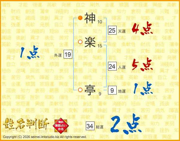 生活面を象徴する運勢です。外部から受ける影響力を表し、結婚運、家庭運や職場、環境への順応性を表します。総運から人運を引いた画数。姓や名が1文字の場合を除く。
