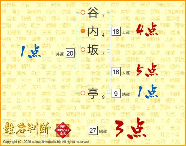 谷(7画)内(4画)坂(7画) 亭(9画)