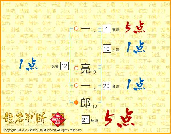 生活面を象徴する運勢です。外部から受ける影響力を表し、結婚運、家庭運や職場、環境への順応性を表します。総運から人運を引いた画数。姓や名が1文字の場合を除く。