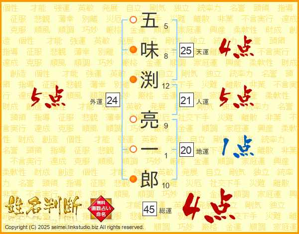 五(5画)味(8画)渕(12画) 亮(9画)一(1画)郎(10画)