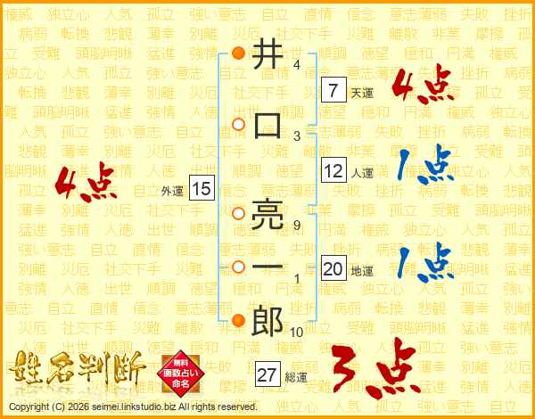 井(4画)口(3画) 亮(9画)一(1画)郎(10画)