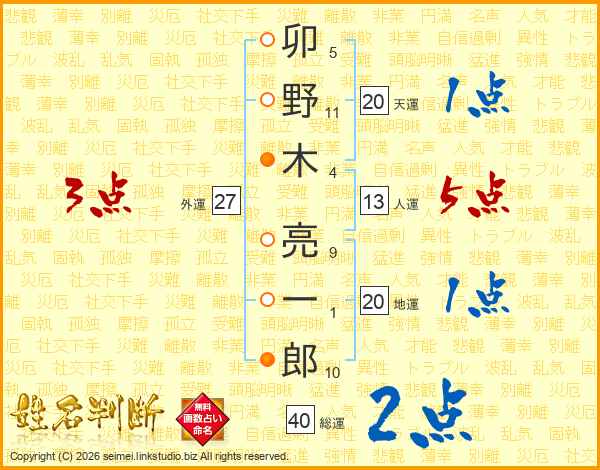 卯野木亮一郎さんの人運は13画の5点!