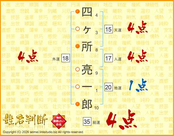 四(4画)ヶ(3画)所(8画) 亮(9画)一(1画)郎(10画)