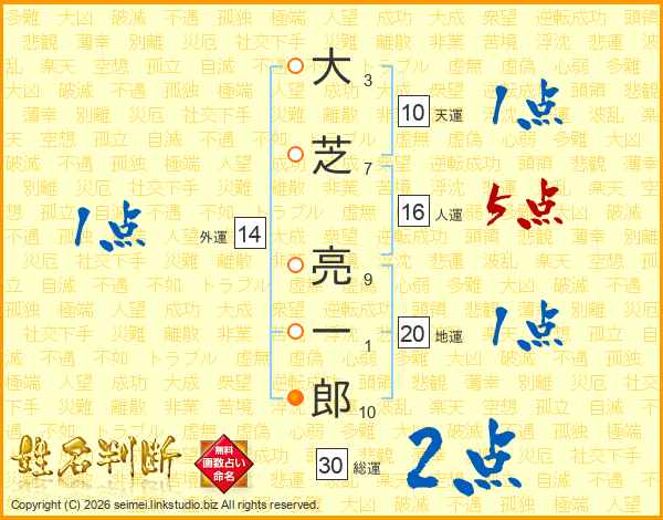 大(3画)芝(7画) 亮(9画)一(1画)郎(10画)