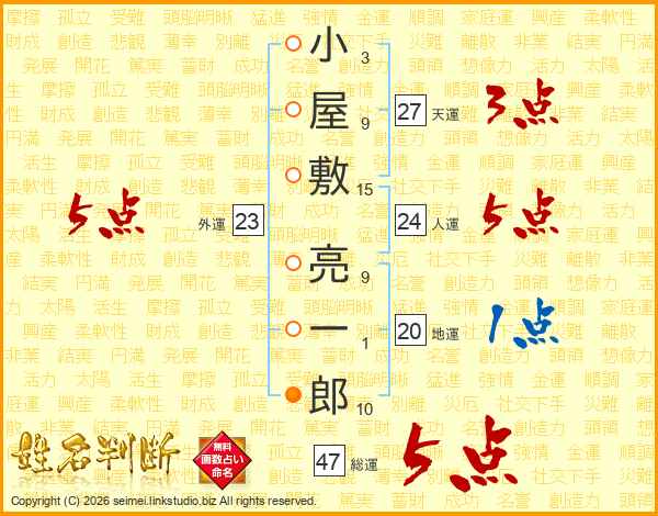 小(3画)屋(9画)敷(15画) 亮(9画)一(1画)郎(10画)