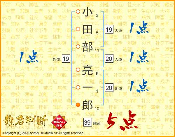 小(3画)田(5画)部(11画) 亮(9画)一(1画)郎(10画)